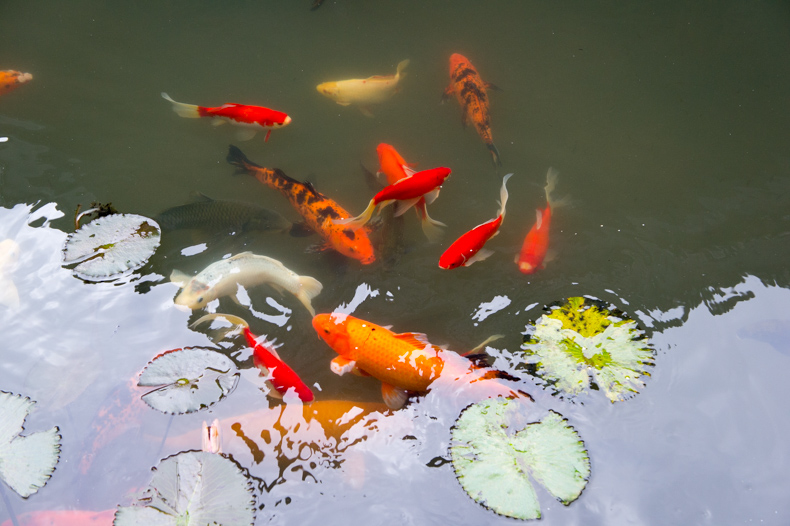 池塘中间一座小亭,水里养着很多金鱼