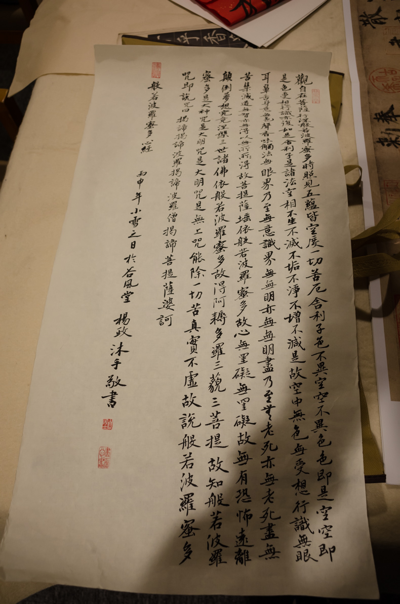 直幅一般取四尺宣纸竖裁,右上盖起首章、闲章,落款后印姓名章。