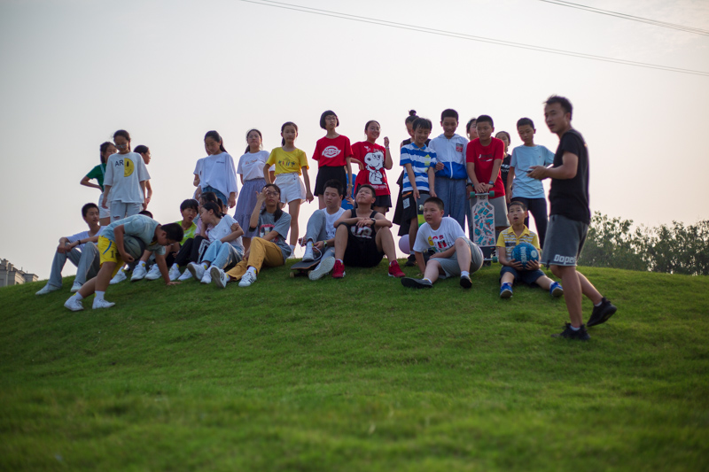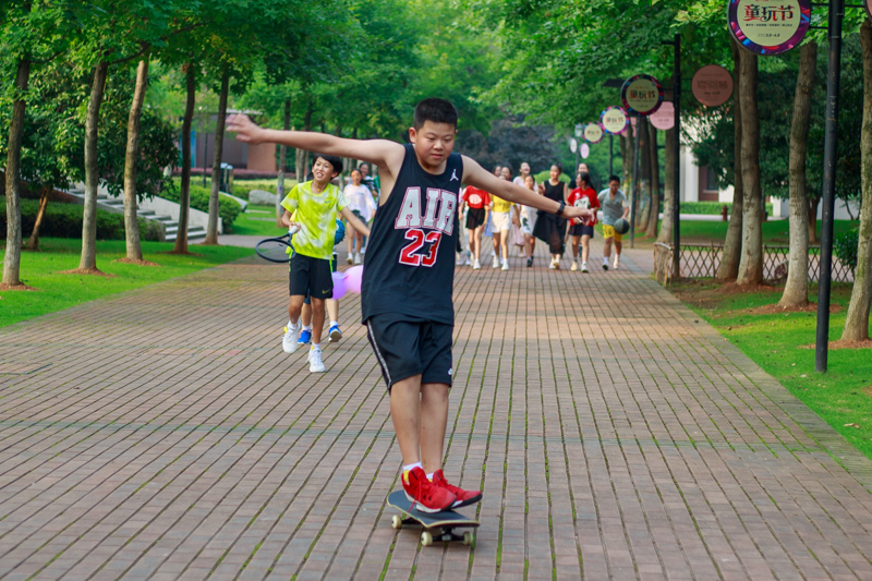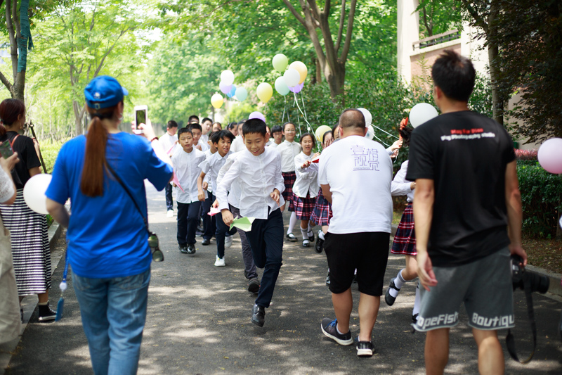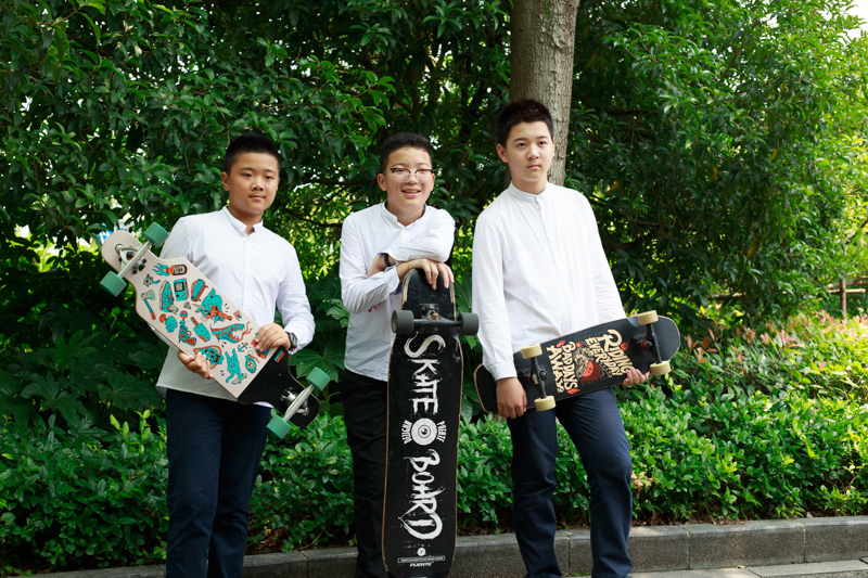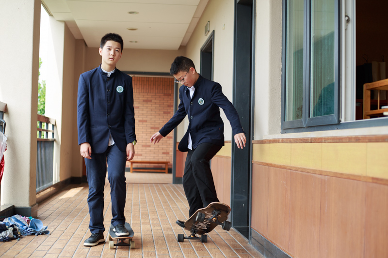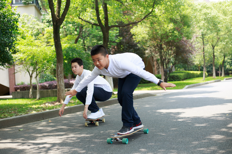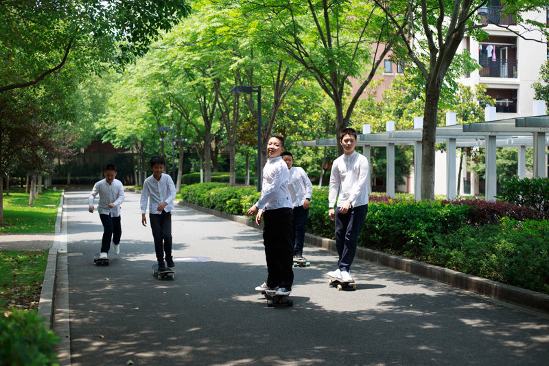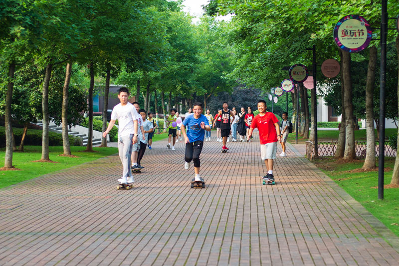 接下来是冲出校门,滑板队打前锋