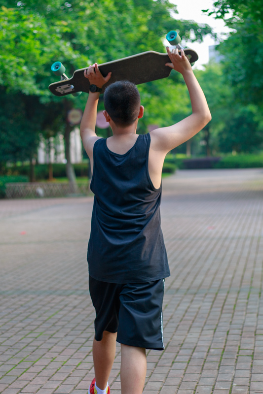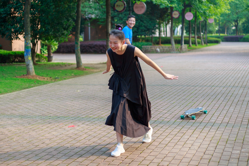 吃过休息后,到楼下去拍个人秀,玩滑板的